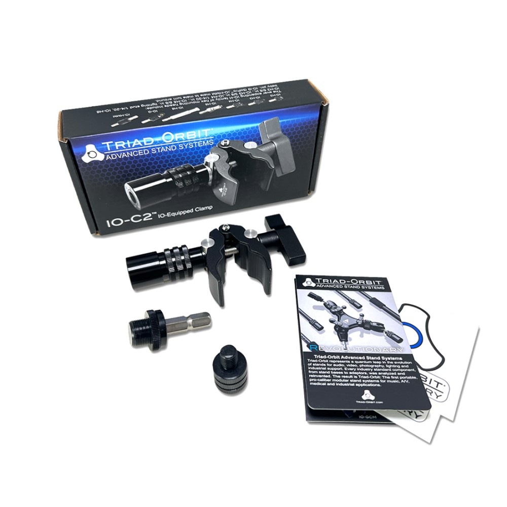 TRIAD-ORBITのアイデア溢れる製品たちを自由自在に生かし切る超便利なアイテムです。IO-Cよりコンパクトで重量も約半分と軽くなっています。大小2ヶ所のクランプポイントを装備し、特に細めのスタンド、シャフトに固定するのにはこちらのIO-C2のほうがより安心です。IO-Cの商品ページ、動画もぜひご覧ください。