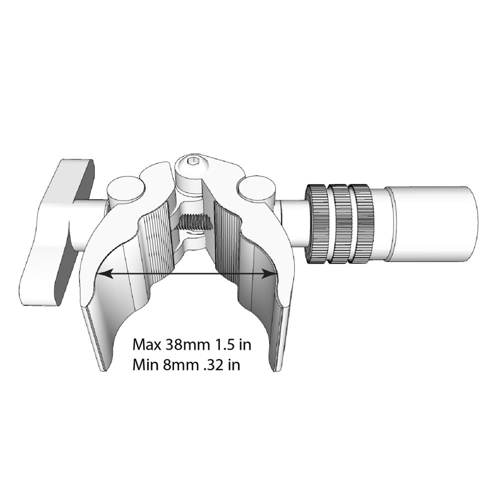 ■大小2ヶ所のクランプポイントを装備。径の太いスタンドはもちろん径の細いブーム、どちらも対応可能。対応パイプ径は 8~38mm。